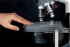 再定焦載物臺(tái)減少了手動(dòng)調(diào)焦的需要,使得操作樣本更加簡(jiǎn)單和安全。在這個(gè)獨(dú)特的設(shè)計(jì)上,在更換標(biāo)本或滴油時(shí)載物臺(tái)可以通過(guò)按壓使載物臺(tái)下降,當(dāng)手移開(kāi)時(shí)載物臺(tái)又會(huì)馬上回到原先的位置,寬大的載物臺(tái)表面可以同時(shí)容納2塊載玻片。