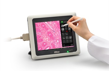 配有大尺寸顯示屏的獨立控制器可以直接完成圖像拍攝,而無需使用計算機。通過使用觸摸屏上的場景模式圖標(biāo)選擇觀察方法,即可完成Digital Sight 相機的簡易設(shè)置和操作??梢允褂脺y量兩點之間的距離等簡易測量功能。另外,還可以進(jìn)行物鏡切換和Ci-E 聚光鏡設(shè)置。通過網(wǎng)絡(luò)功能,可以在觀察期間在多臺遠(yuǎn)程PC上共享實時圖像。