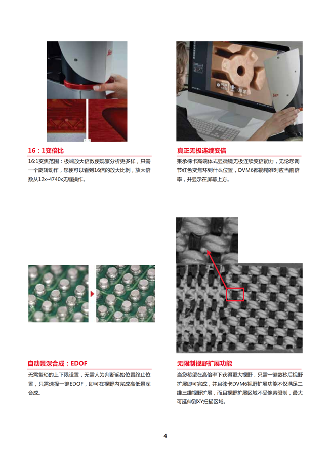 在諸多應(yīng)用場(chǎng)合下,它能為傳統(tǒng)方式提供理想的質(zhì)量控制輔助。數(shù)字顯微鏡生成的圖像將直接顯示在高分辨率顯示器上,因此您無(wú)需透過(guò)目鏡觀察。變倍光學(xué)元件采用流線型設(shè)計(jì),即使是極難觸及的表面也能有效深入,相對(duì)于費(fèi)時(shí)費(fèi)力的傳統(tǒng)顯微鏡檢驗(yàn)技術(shù),它甚至還能對(duì)大型靜態(tài)部件進(jìn)行無(wú)損檢驗(yàn)。Leica DVM6數(shù)字顯微鏡不僅具備出眾的光學(xué)品質(zhì),還在量化分析方面表現(xiàn)卓著,無(wú)論是二維分析還是高級(jí)三維表面測(cè)量。設(shè)備一體化設(shè)計(jì),功能高度集成,外觀給您簡(jiǎn)潔大方,接觸使用給您不負(fù)眾望!