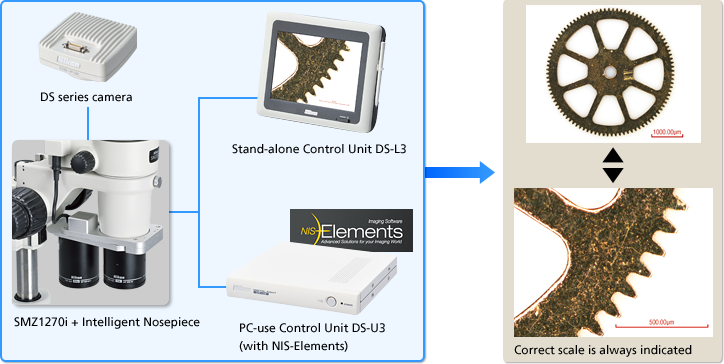 結合DS-L3相機控制器或NIS-Elements圖像軟件,SMZ1270i可以檢測變倍信息。同時,配合智能型P-RNI2物鏡轉盤配件可以檢測當前使用的物鏡。變倍信息結合物鏡信息,系統(tǒng)可自動改變圖像標尺大小,當您在改變倍率時圖像中的標尺與測量信息將會自動對應。